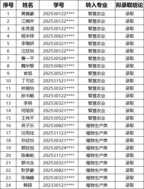 根据《关于做好2025年本科生转专业工作的通知》以及《2025年本科生转入植物科学技术学院与智慧农业书院工作方案》,经学生自主申请,我院于2025年12月27日组织专家对学生的综合知识结构、思维能力、语言表达能力、个性品质等综合素质进行考核。根据考核结果及第一学年成绩GPA核算录取成绩后,拟录取黄嘉豪等24名学生进入2025级智慧农业或2025级植物生产类专业学习,现将名单公示如下: