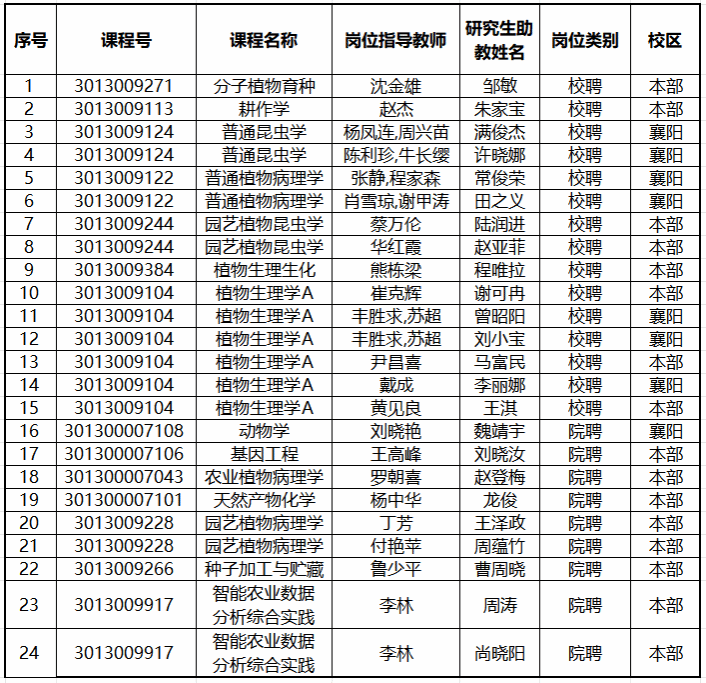 根据《华中农业大学研究生“三助一辅”实施办法》的通知(校发{2023}157号)文件精神,经个人申请与课程主讲教师推荐,学院结合岗位需求对申请材料进行审核,拟聘用以下本科生课程研究生助教同学,现将名单公示如下: