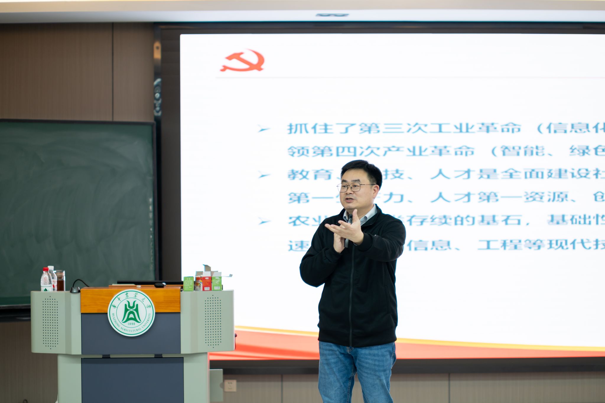 授课过程中,周雄以"智能时代的劳动价值""农业强国与青年使命"等现实命题引导同学们深入思考。他鼓励大家将党课所学转化为实践方法论,在科研创新、学业提升与志愿服务中先练"先锋"之功,再答"入党"之卷,以实际行动接受组织考验。