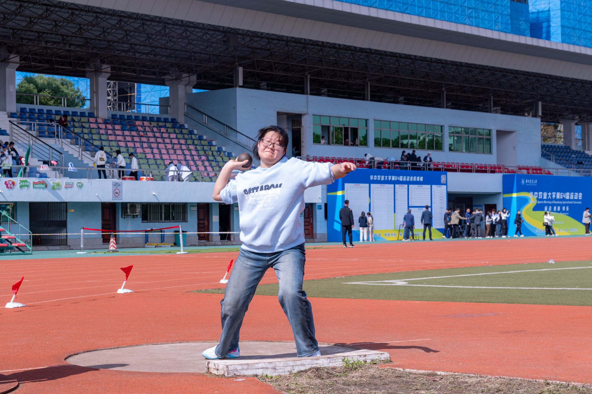 植保2301班韦玮则在本届运动会上实现新突破,首次征战女子铅球项目便斩获亚军,展现了跨界运动的超强实力。作为曾经校女篮主力队员、院女篮新生杯教练,同时在标枪与羽毛球领域均有建树的运动达人,韦玮始终秉持“敢想敢拼”的精神,不断挑战自己的运动边界。“不同运动之间是互通的,女篮训练培养的核心力量、标枪训练打磨的发力节奏,都让我在铅球项目中快速找到状态,少走了很多弯路。”