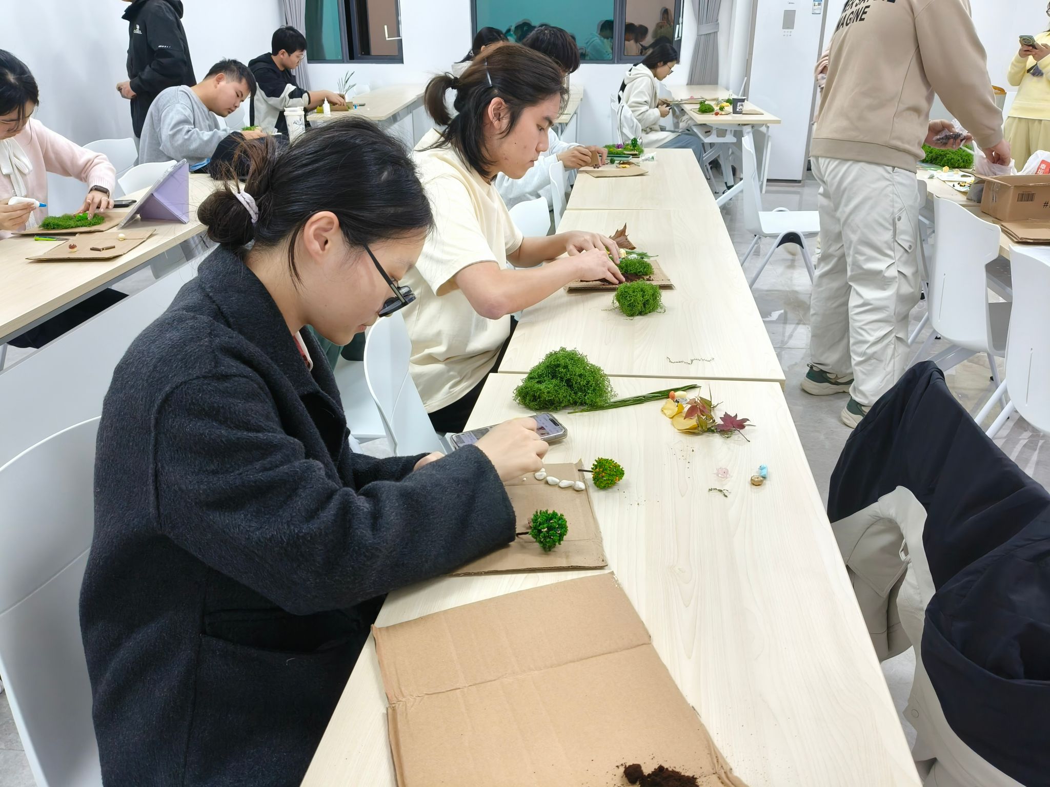 “一叶知秋,一板成森”活动,同学们以废纸箱成基座、咖啡渣作土地、落叶为点缀,亲手搭建秋意微缩世界。废物利用,让环保理念与美育实践深度融合,赋予平凡旧物新生意义。
