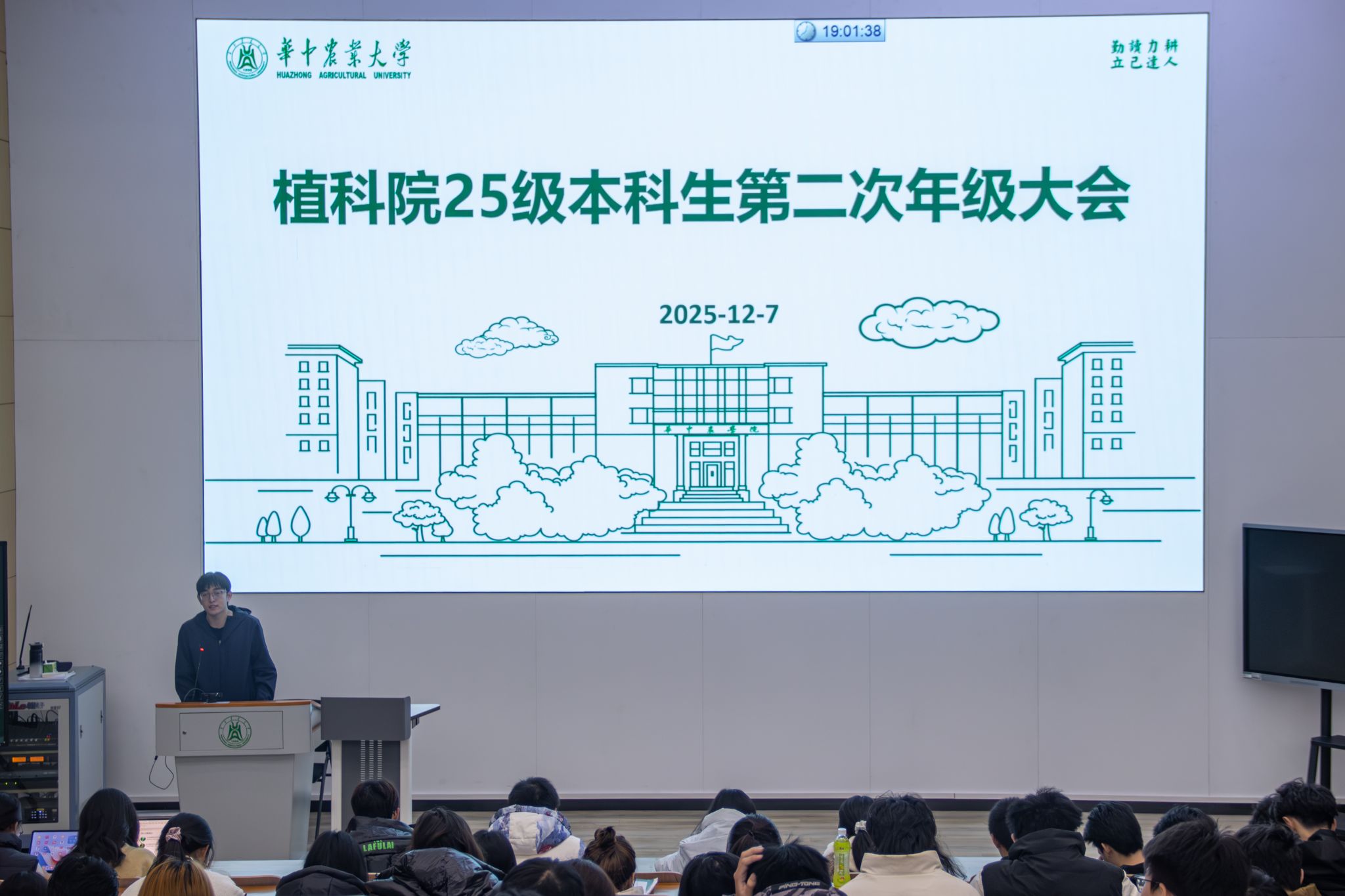 12月7日晚,学院于第三教学楼S1报告厅顺利举办2025级本科生第二次年级大会,同步开展“职引计划”第五十一讲活动。会议由辅导员张泽雷主持,特邀智农2205班王佳琪、智农2205班夏吴晶、植保2302班胡曦月三位优秀学生代表分享成长经验,全体25级本科生全程参与。