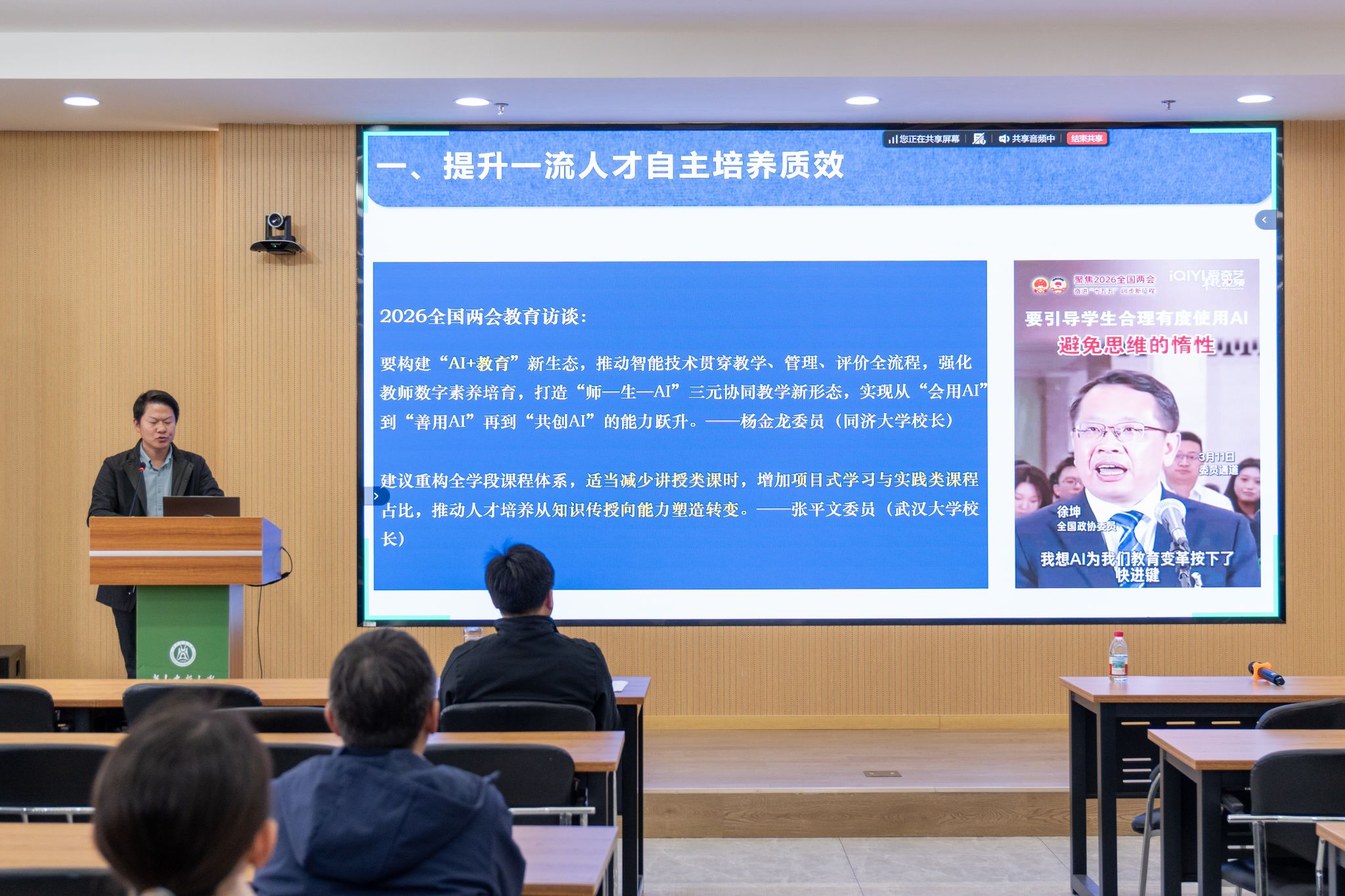 院长金双侠作2026年工作部署报告。报告紧扣全国两会精神和学校“十五五”发展纲要规划,阐释新一轮“双一流”建设与交叉学科融合发展的战略意义,传达学校工作部署会精神,从六个方面部署了学院2026年工作要点。一是提升一流人才自主培养质效。强化数智赋能,推动本科教学核心资源提质增慧,深化教育教学改革创新,加强专业内涵建设和质量保障体系建设;深化产教融合、科教融汇,强化有组织培育研究生拔尖创新人才。二是加强学科建设,提升核心竞争力。坚持“质量导向、贡献导向”,围绕国家战略和产业需求制定建设方案,加强学科队伍建设,强化资源配置,促进交叉融合。三是建设一流人才团队。围绕学科重点领域和领军人才,以团队建设为抓手,主动引才、以才引才;坚持分类指导,推动人才评价改革。四是提升科技创新和社会服务效能。坚持国家重大需求导向,聚焦原始创新和关键核心技术攻关,强化有组织科研,推动科技创新和产业创新深度融合,推进重大平台建设,促进成果转移转化。五是扩展合作交流,提升国际影响力。有效利用世界一流教育资源和创新要素,扩大高水平国际学术交流和教育科研实质性合作,积极参与全球粮农治理。六是提升学院治理能力水平。以品牌打造、校友挖掘、队伍优化为重点,增强组织力、执行力,加强学院文化建设和管理体制建设。另就近期重点工作作提醒。