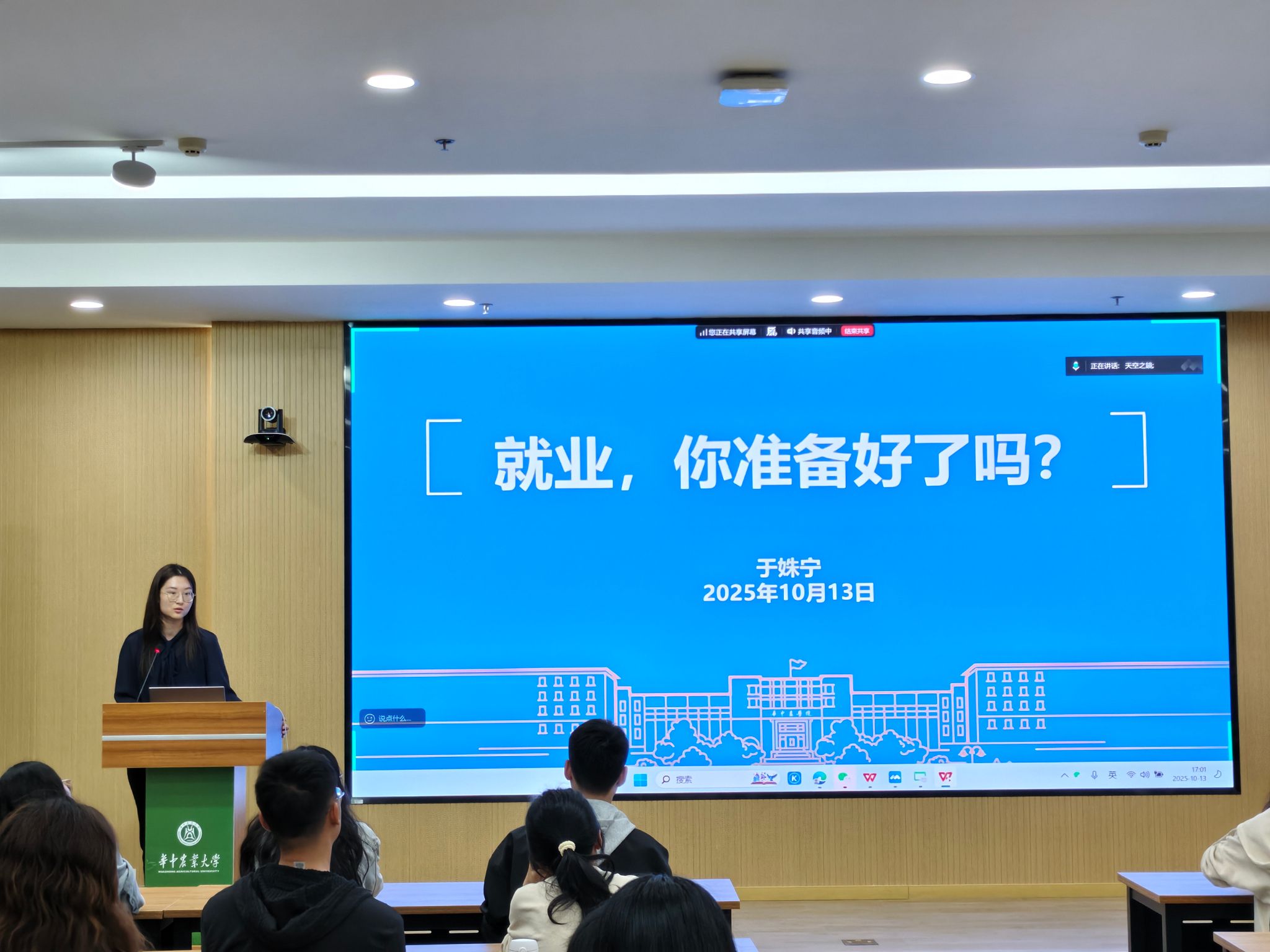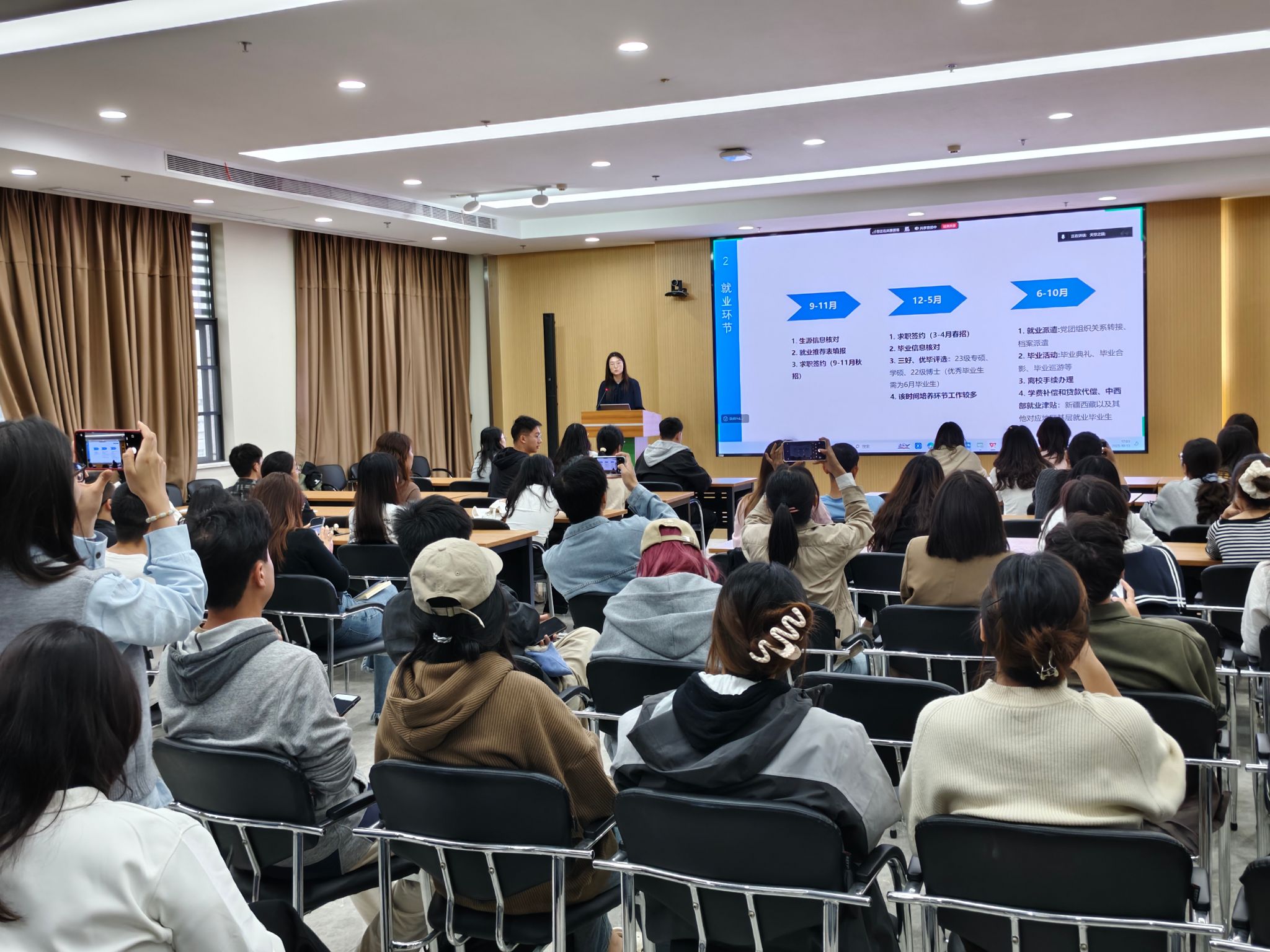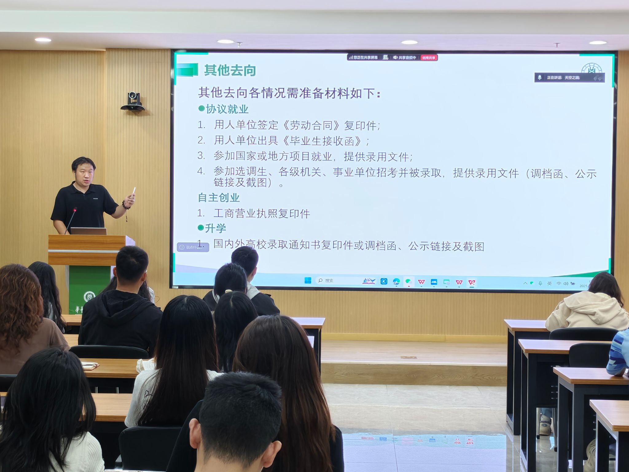 本次培训会上,于姝宁老师围绕时间规划、就业形势、就业准备及就业礼仪开展就业动员,为同学们详细分析了就业环境与往届去向、讲解就业证明材料开具方法。于老师生动讲述并鼓励在座的毕业生们脚踏实地,抓住“金九银十”这个黄金时间,充分做好就业准备,实现高质量就业。