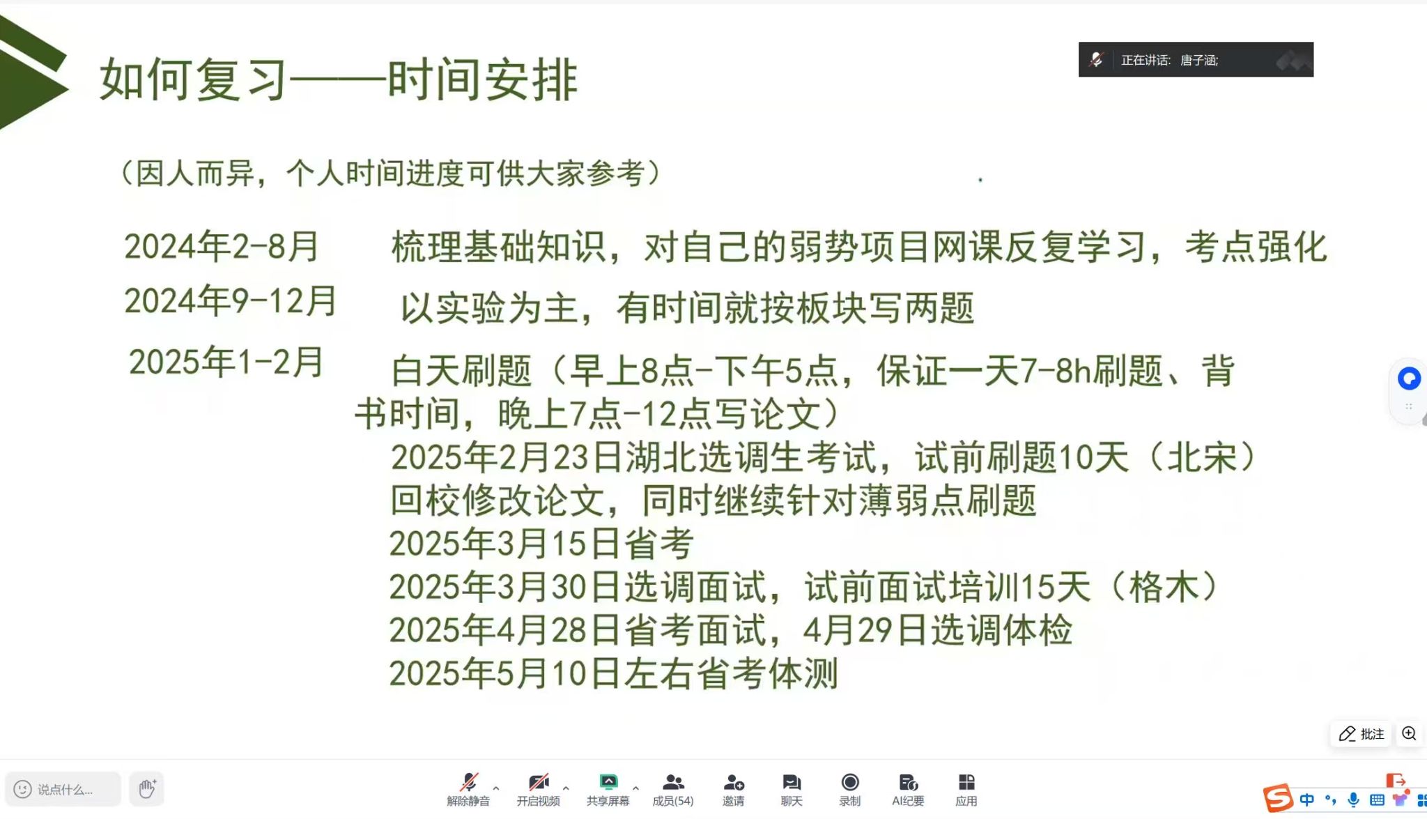 唐子涵从重要考试的时间内容、复习途径与时间规划、应试注意事项等方面展开,强调选考信息、系统复习及应试细节的重要性;安家祥结合个人备考经历,从选岗、应试技巧到笔面试历程等方面完整介绍备考流程,着重分享了自我认知、科学备考及大胆尝试的心态;龚馨则从自身经历出发,简述了自己职业选择的心路历程,而后从相关政策、备考题型、基层工作等方面介绍了湖南选调的系列要点,并分享了自身的感受与备考建议。