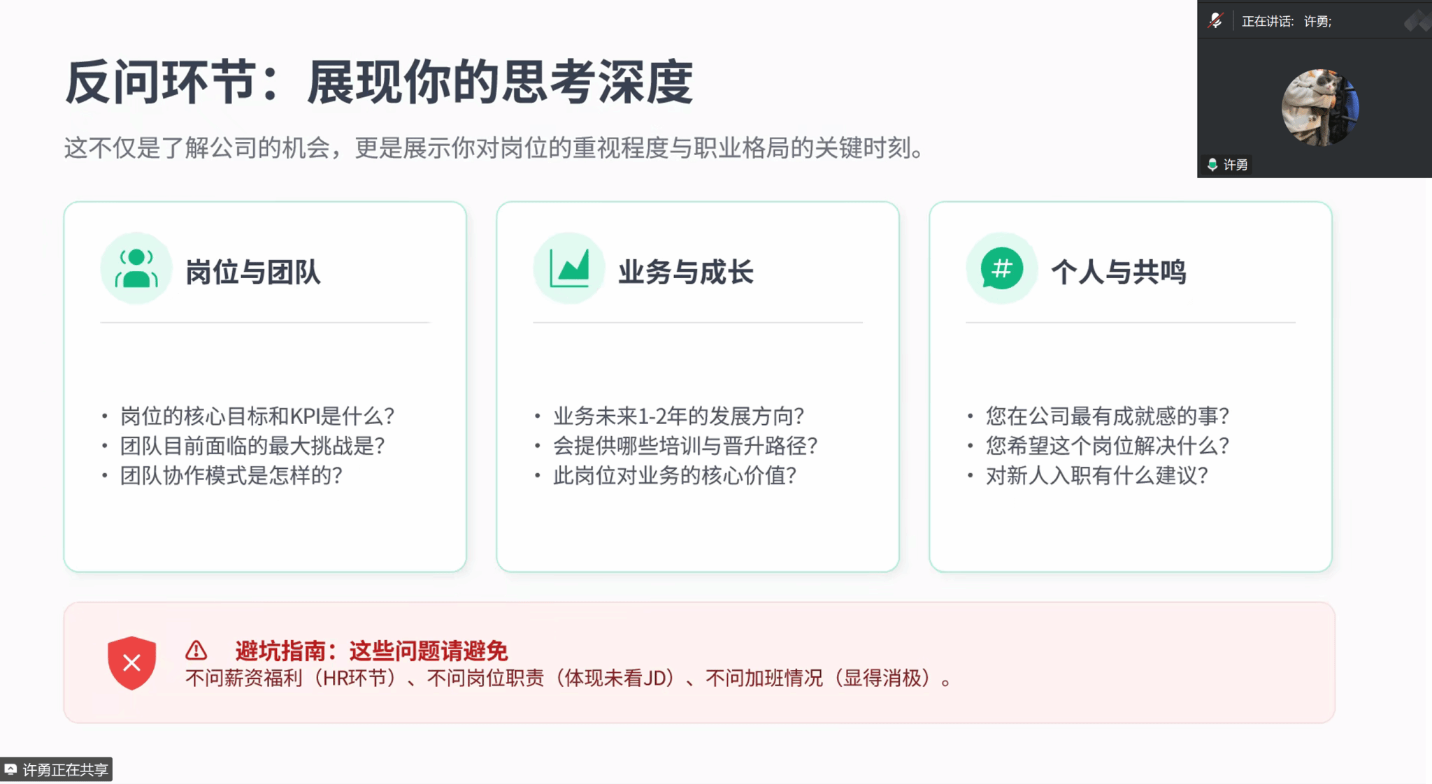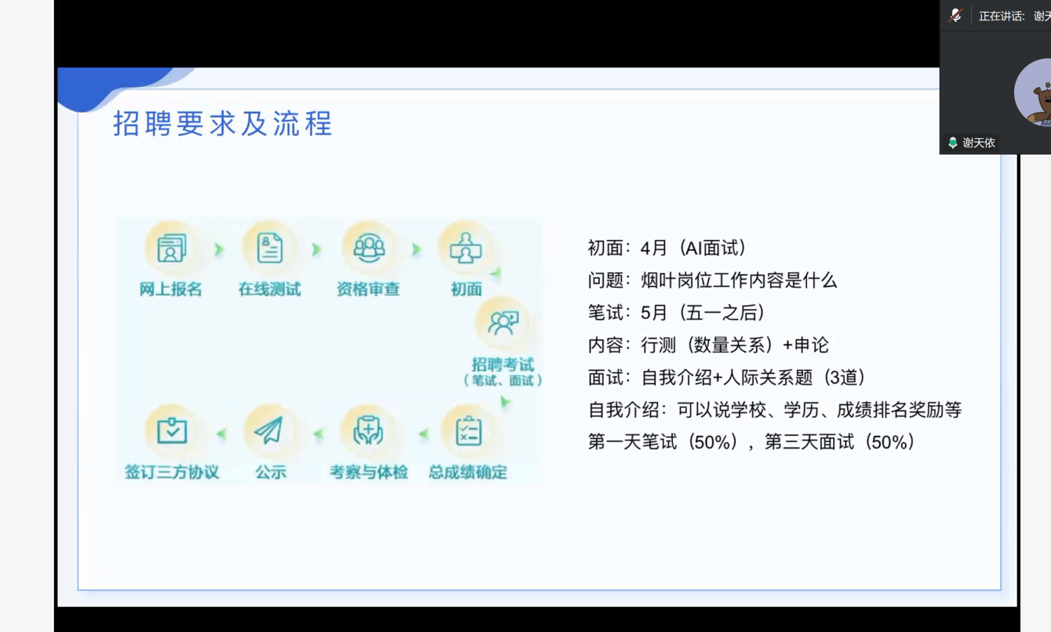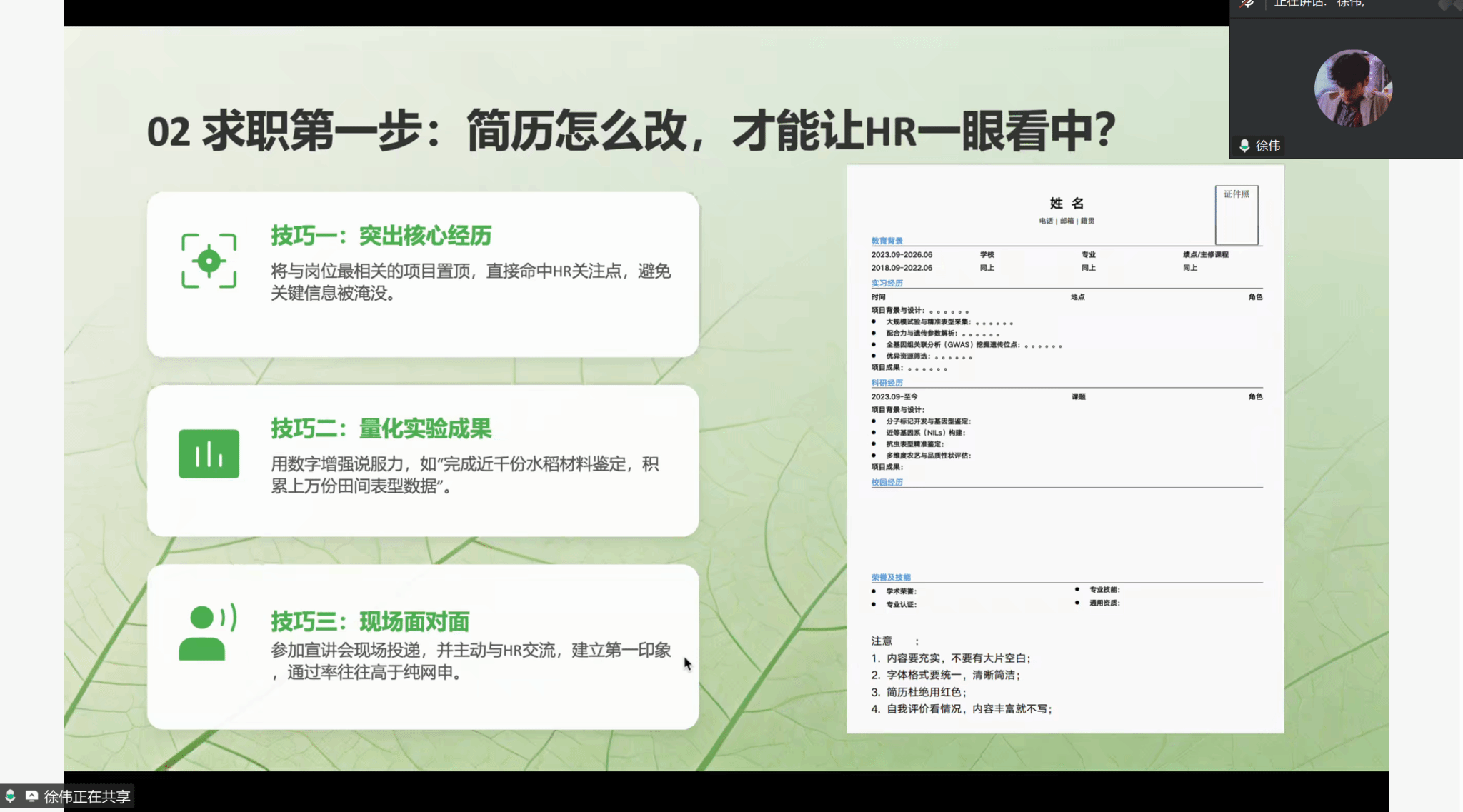 谢天依主要从所在企业的招聘要求及流程、工作内容、职业发展路径等方面展开,厘清了烟草专卖局与中烟工业的核心差异,以及公司职称与技能双轨发展路径;许勇从用人偏好洞察、简历打磨、面试通关、职业规划四大维度完整拆解求职流程,分享企业招聘软硬标准、面试高频问题应对技巧,强调精准选企与长期职业成长;徐伟以自身校招经历为依托,从简历优化、校招信息收集、岗位解析、面试实战等内容,讲解农科岗位求职要点、简历量化技巧与岗位投递计划表制作,并给出offer抉择及细节核查建议。