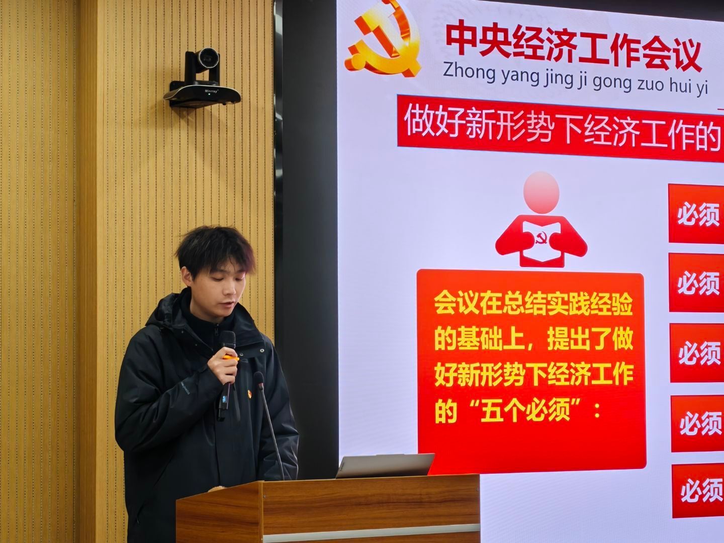 作物栽培研究生第一党支部书记刘振楠领学习近平总书记在中央经济工作会议上的重要讲话精神。他重点解读了"五个必须"规律性认识,并结合农业科研领域实际谈到,青年学生党员要深刻把握"国之大者"的内涵,主动对接"坚持创新驱动"的时代要求,将科研方向与国家粮食安全、农业高质量发展等战略需求紧密结合,以扎实的科研实践为"十五五"良好开局贡献青春力量。